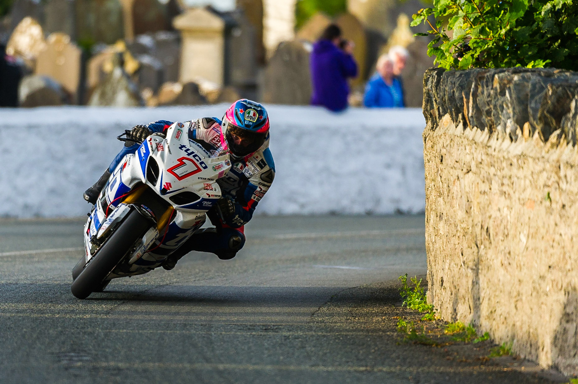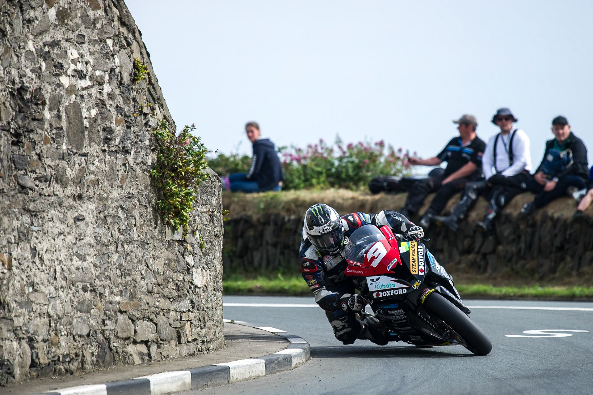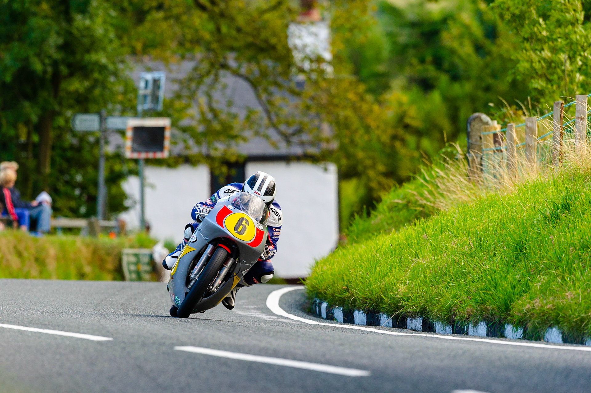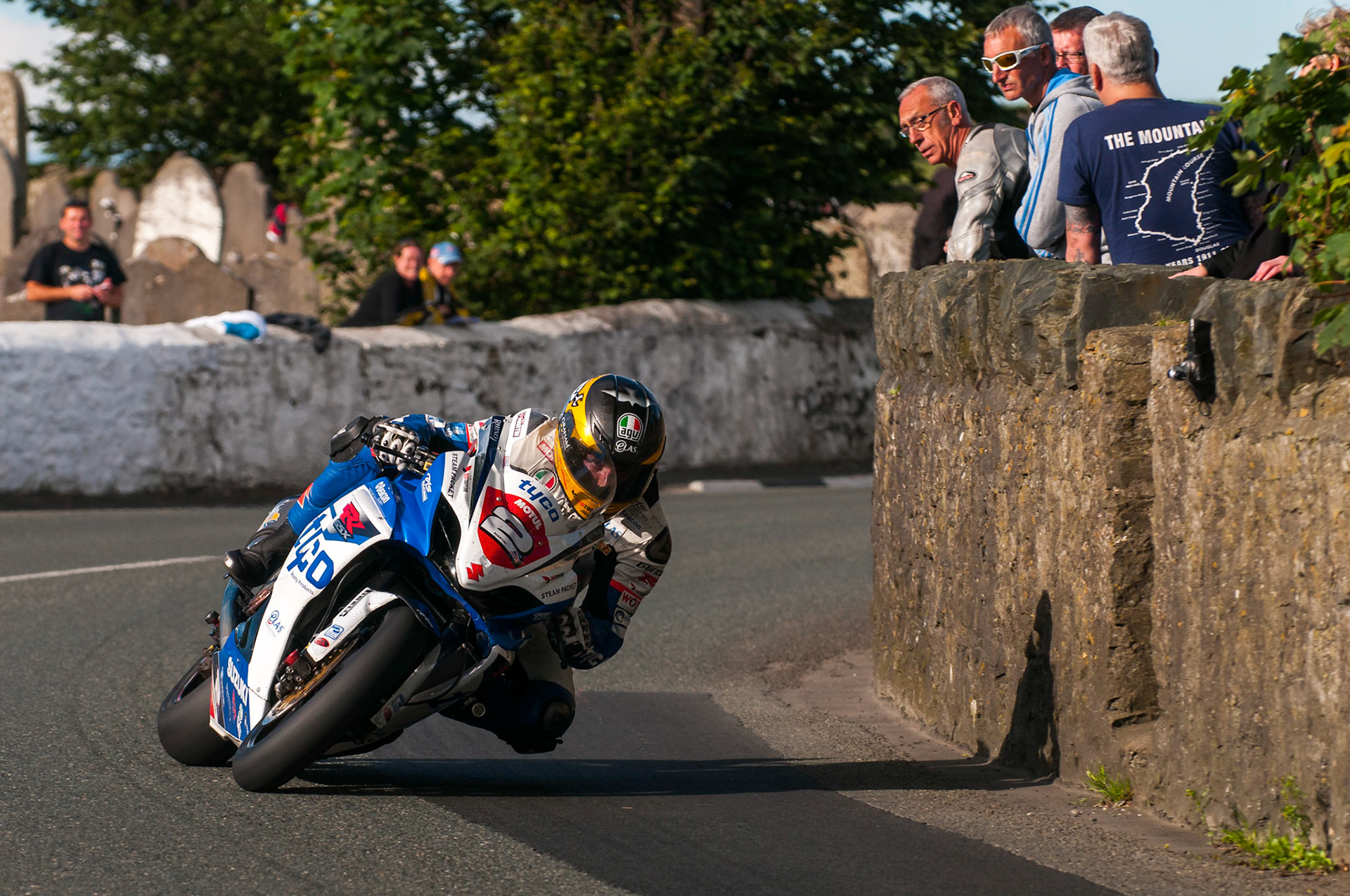 John McGuinness (Team Winfield Paton) at the top of Barregarrow during practice for the Senior Classic TT at the 2014 Festival of Motorcycling. Image by Tony Goldsmith.
